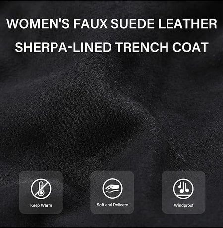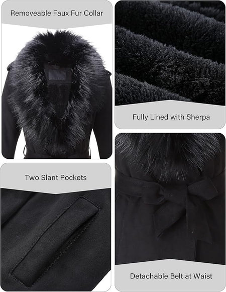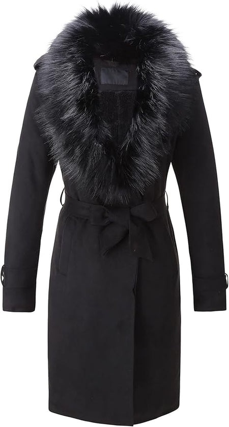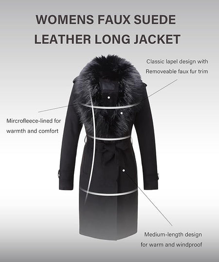 Bellivera Women Faux Leather Trench Coat Fleece-Lined Mid-length Jacket with Detachable Fur Collar